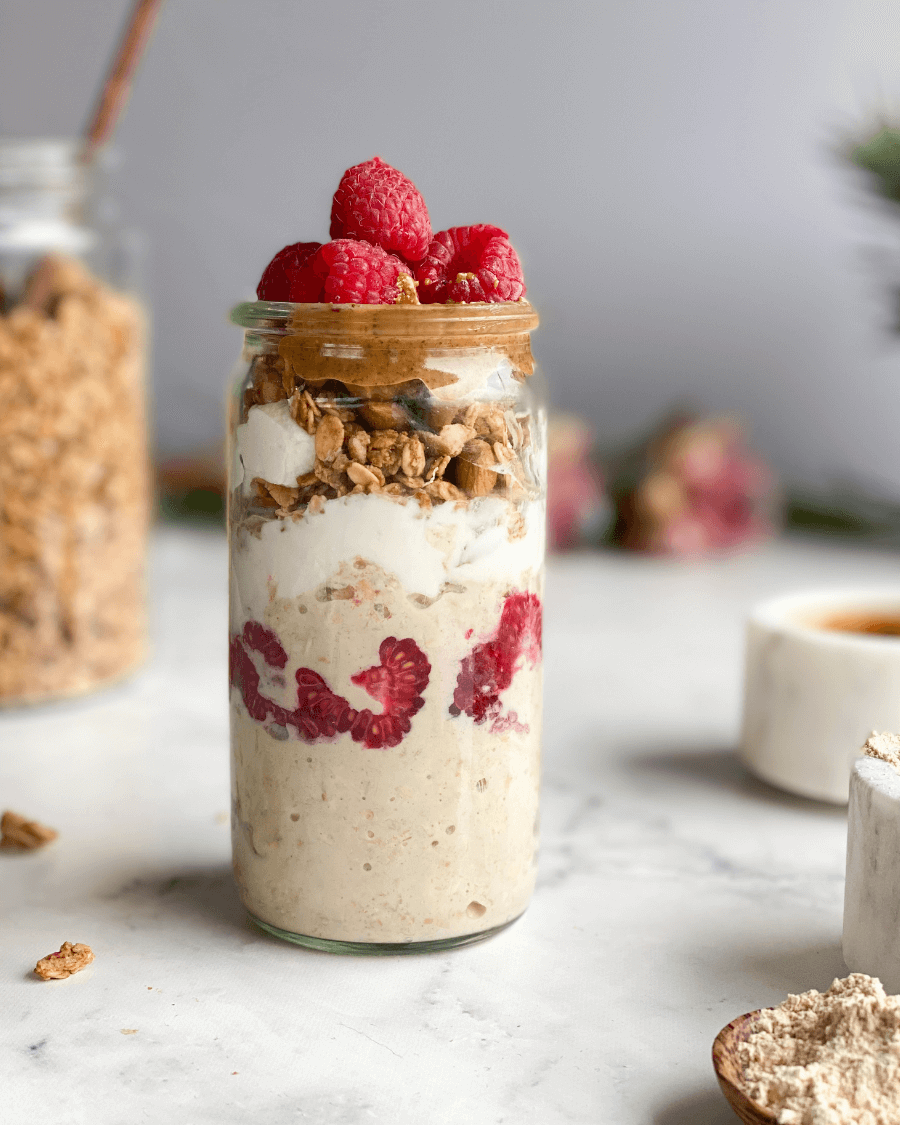 | 2 | Add the oats to a jar and pour over the milk blend, mixing well |